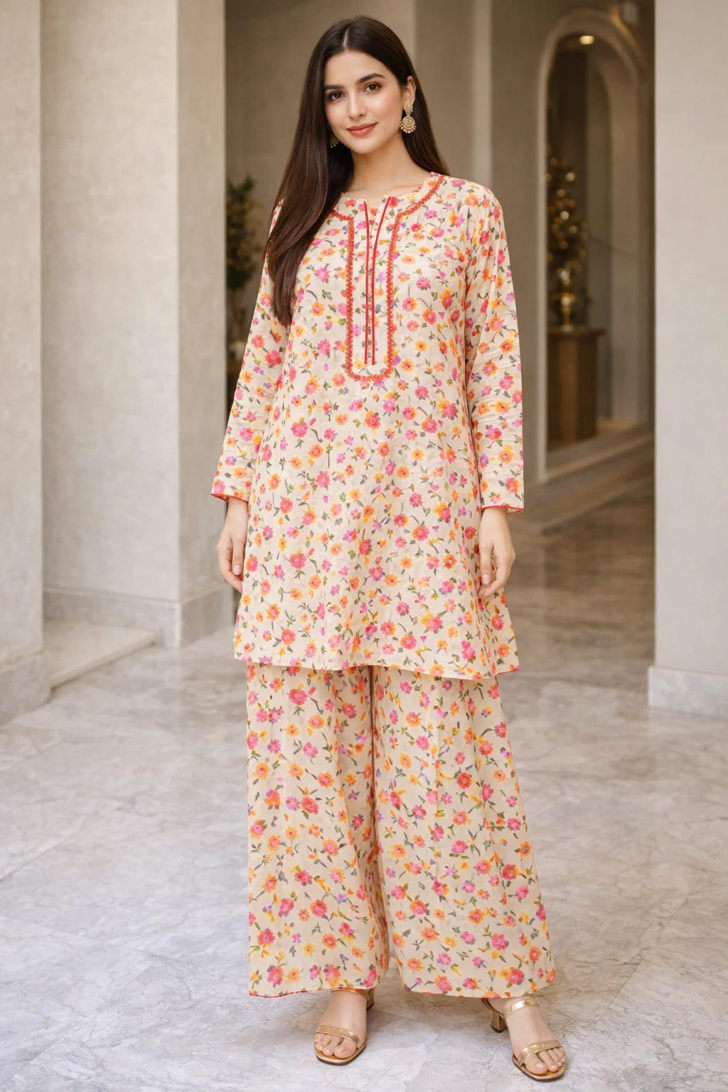 • Printed plazo with low side slits and an elasticised waistband
